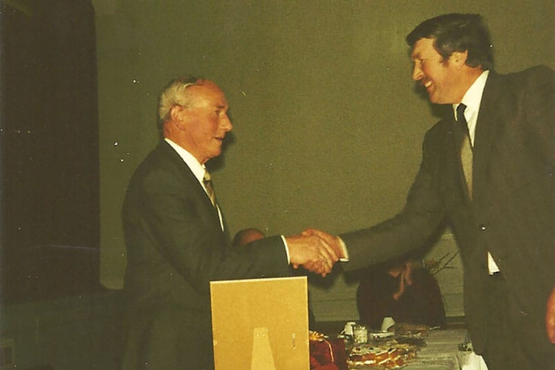Angus Macleod (left) shaking hands with colleague Ian Matheson on the occasion on Angus’ retirement in May 1989. (Right) Greta MacDonald with one one the first computers used at the PO. © Donald Brown / Greta MacDonald