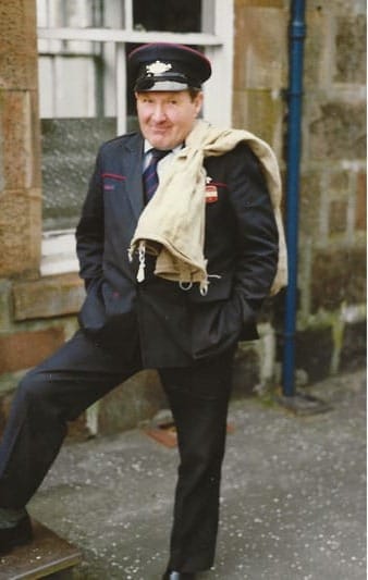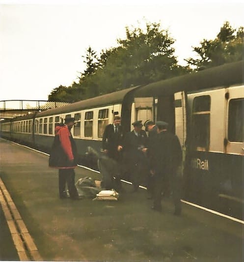 (Left) Bert Skene waiting at Ardgay Station for the 1pm train with a small bag of mail for Lairg. (Centre) First letter dispatch which was put onto the 3pm train. (Right) Postmen on the last day that the mail arrived by train into Ardgay on Saturday 1st October 1988. © Donald Brown / Greta MacDonald