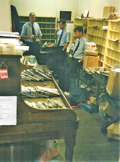 (Left) Paul Maclaren joined in 1993 and left to join the police in 2000. (Right) Some of the Ardgay staff taking a break from sorting the Christmas mail in 1984. Left to Right; Greta MacDonald, Ian Matheson, Jackie MacGregor, Bert Skene, Adam Henderson, Angus Macleod. © Donald Brown / Greta MacDonald