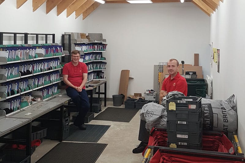 Left) Ken Mackay began in Ardgay Post Office taking over from Paul MacLaren in September 2000 and retired exactly 20 years later. In the photo, Ken’s last day on 12th September 2020. Left to right: Calum Matheson, Donald Matheson, Ken Mackay. (Right) Temporary sorting office at The Barn. © Donald Brown / Greta MacDonald