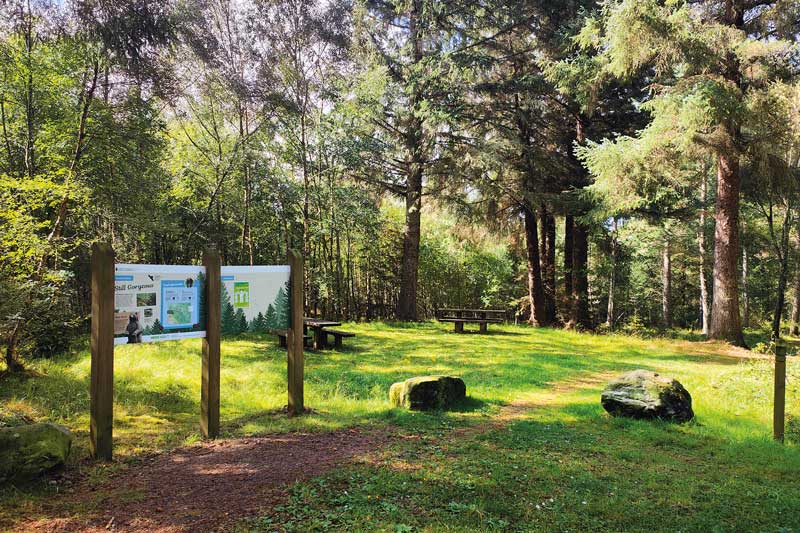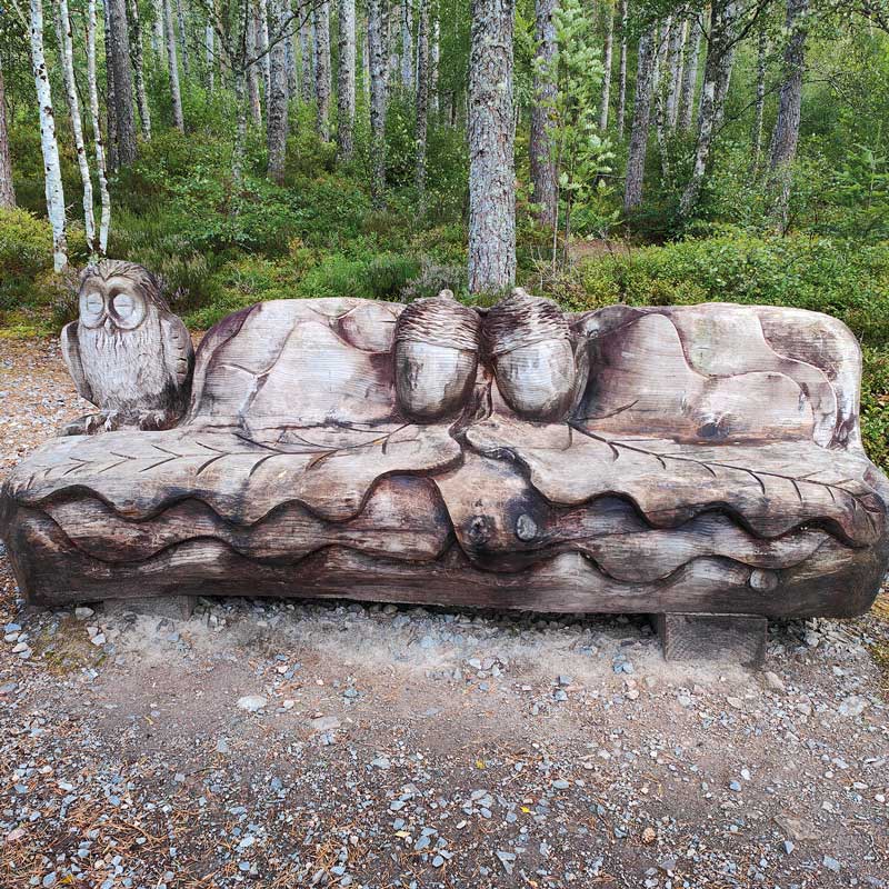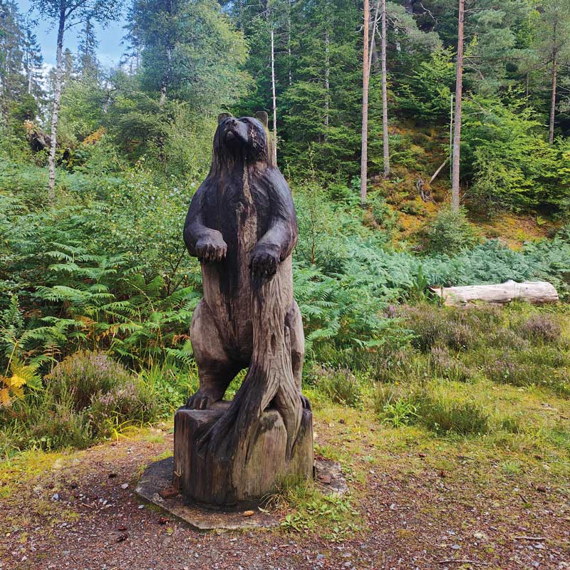 A carved bear and traces of the storm that damaged the original circular path. (Right) There is a picnic area near the car park. © Silvia Muras