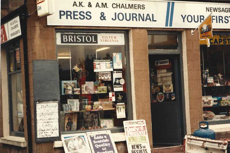Sandy & Angela Chalmers’ newsagent in Bonar Bridge East End (now Bonar Bridge Pharmacy). Late 1970s. © Angela Chalmers