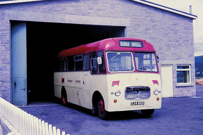 Sutherland Transport had a garage in South Bonar, where Ardgay Game is today. Sutherland Transport & Trading Co started as a horsedrawn mail coach between Lairg and Tongue in 1868. After changing hands a few times, in the late 60s it was purchased by Johnson of Lairg. It had a small fleet of Bedford VAS buses, equipped with large mail areas at the rear, to operate Royal Mail contracts. The company dissolved in 1982.