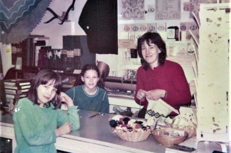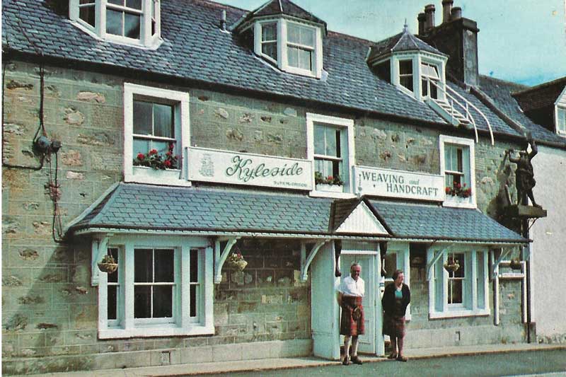 Inside Kyleside Weaving shop in Bonar Bridge. (Right) Dr & Mrs McGregor outside their shop. As well as local staff they employed in the summer students from Glasgow to do the weaving, with local gamekeepers manufacturing the buttons. © Sarah Horne