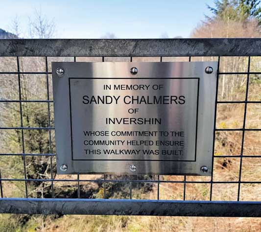 There are light switches on both sides, providing illumination at night. (Centre) A plaque in memory of Sandy Chalmers was erected in 2018. (Right) The path as it approaches Culrain station. Photos © Katrin Lopes-Carrie