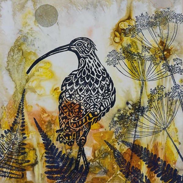 LW: Eco prints are natural prints made using leaves and flowers, sometimes I also use onion skins. These are arranged and layered between sheets of heavyweight watercolour paper, tied tightly with string and steamed for 2 hours; during this process the natural dyes transfer to the paper producing unique eco prints. Papers are then dried flat and overprinted using my hand carved printing blocks. Other methods of printmaking that I use are Monoprinting, Drypoint Etching, Block Printing (Linocut), Collagraph and Cyanotype.