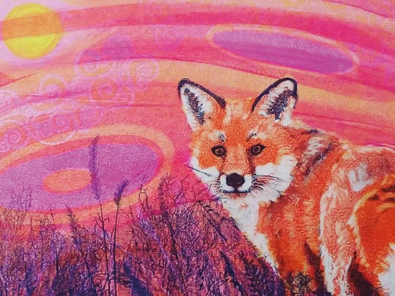 (Left) Curlew Ecoprint, (centre) Mr Fox, multilayered ink monoprint (right) Louise at her studio. © Louise Worthy