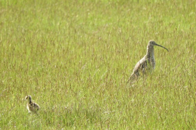 (Left) Curlew adult and juvenile, around the end of May. Golden Plover on the horizon above the sheep fank. © George Ross